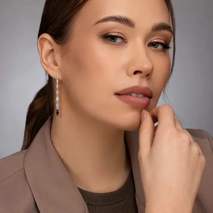 עגילי זהב באורך 3.8 משובצים יהלומים לבנים ושחורים
