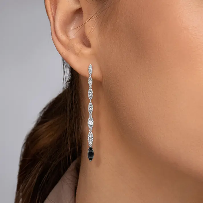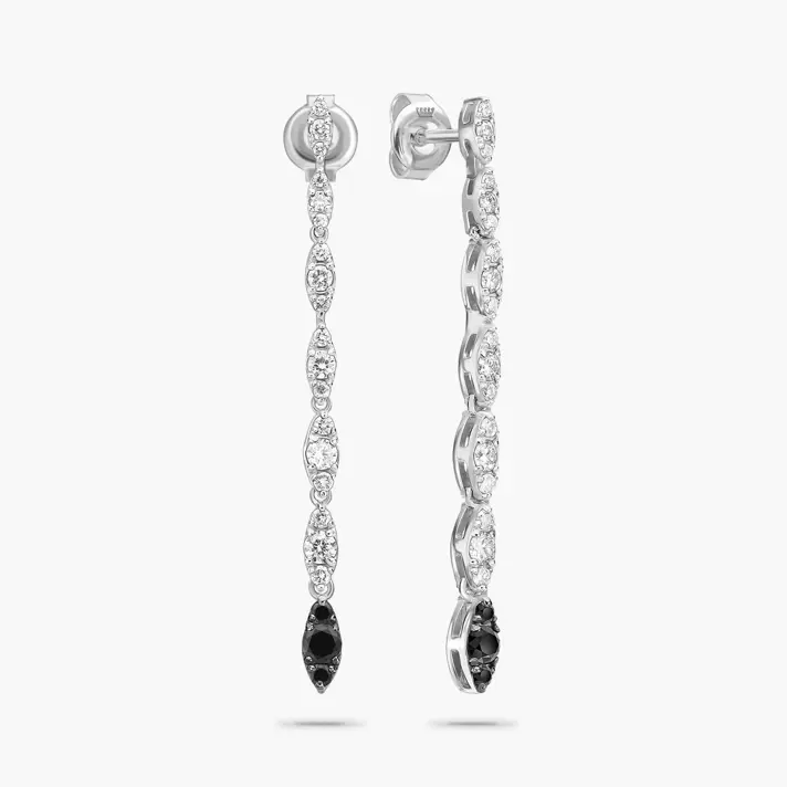 עגילי זהב 14K באורך 3.8 ס"מ המעוצבים עם מעויינים מעוגלים המשובצים יהלומים טבעיים ונוצצים ובקצה העגילים מעויין המשובץ ביהלומים שחורים טבעיים. סה"כ משובצים בעגילים 36 יהלומים לבנים ועוד 6 יהלומים שחורים.