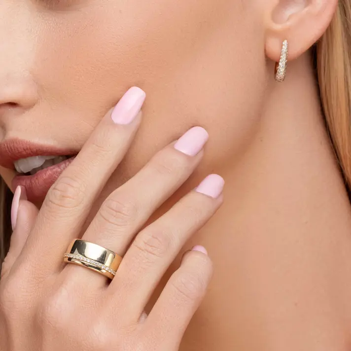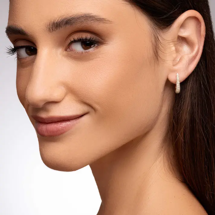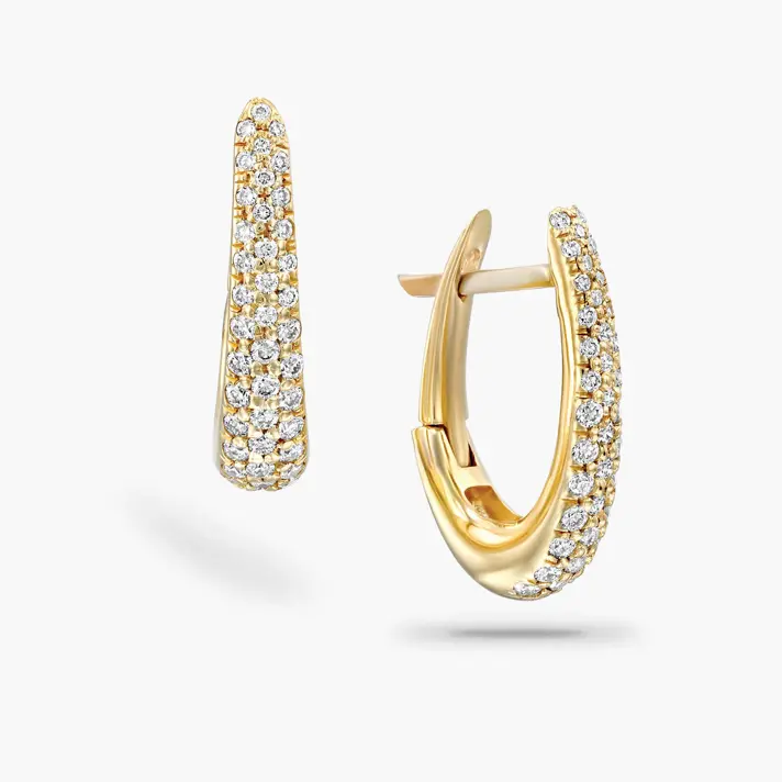 עגילי זהב 14K בצורת בננה משובצים 80 יהלומים טבעיים ונוצצים במשקל 0.45 קראט . גובה העגיל 1.6 ס"מ, עובי מקסימלי 3.5 מ"מ
