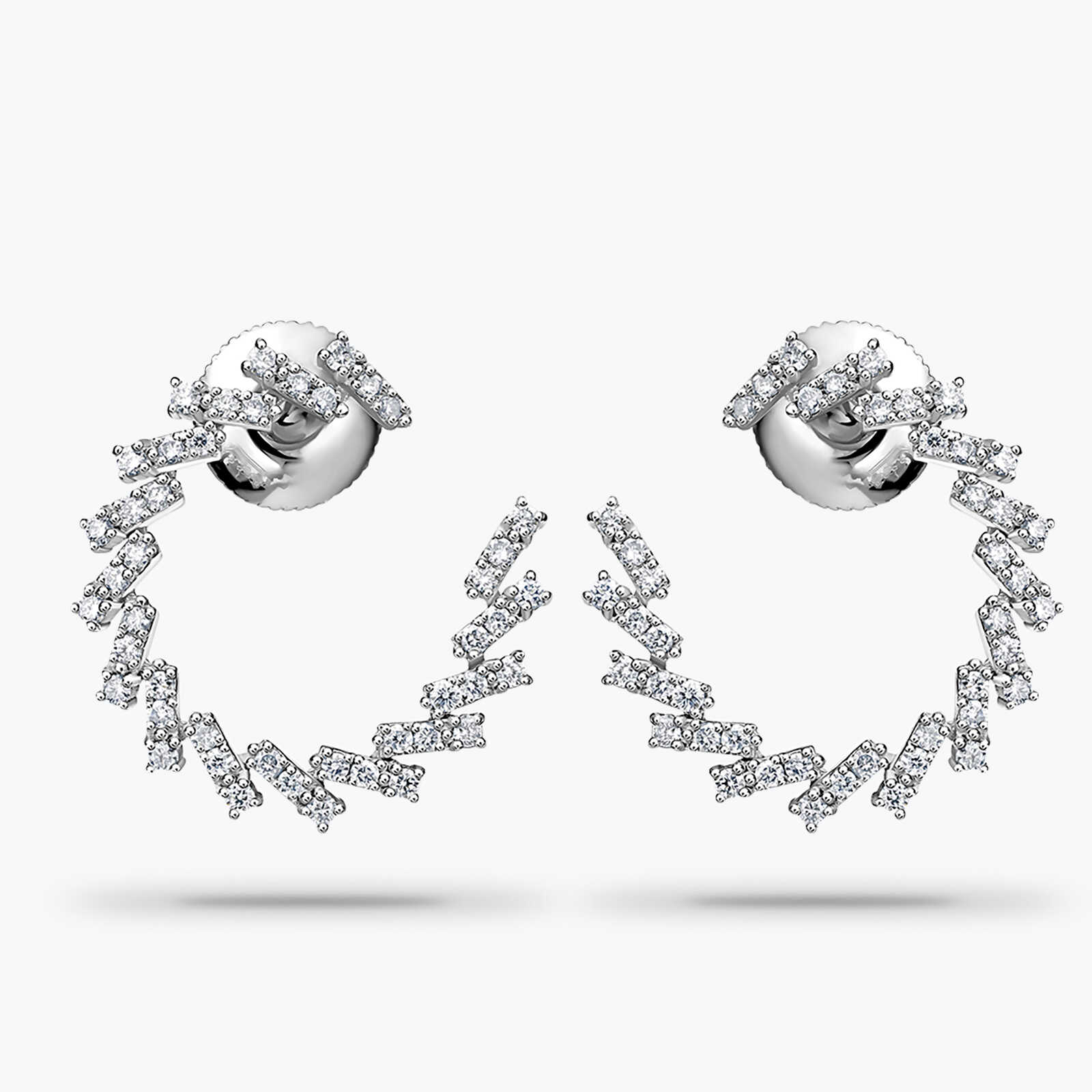 עגילי זהב 14K המעוצבים כמעגל לא סגור המורכב מצורות מלבניות המשובצות ב 90 יהלומים טבעיים ונוצצים. קוטר העגיל 1.4 ס"מ