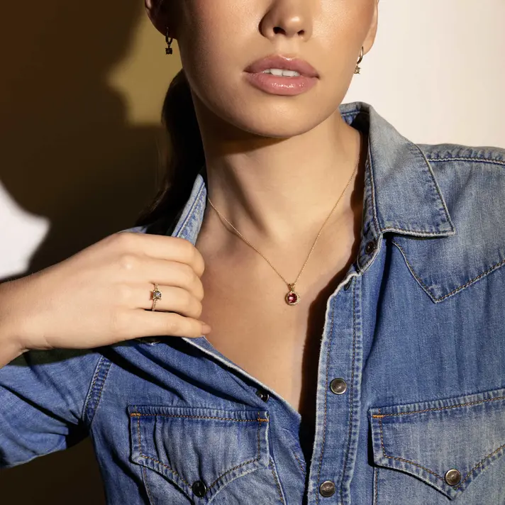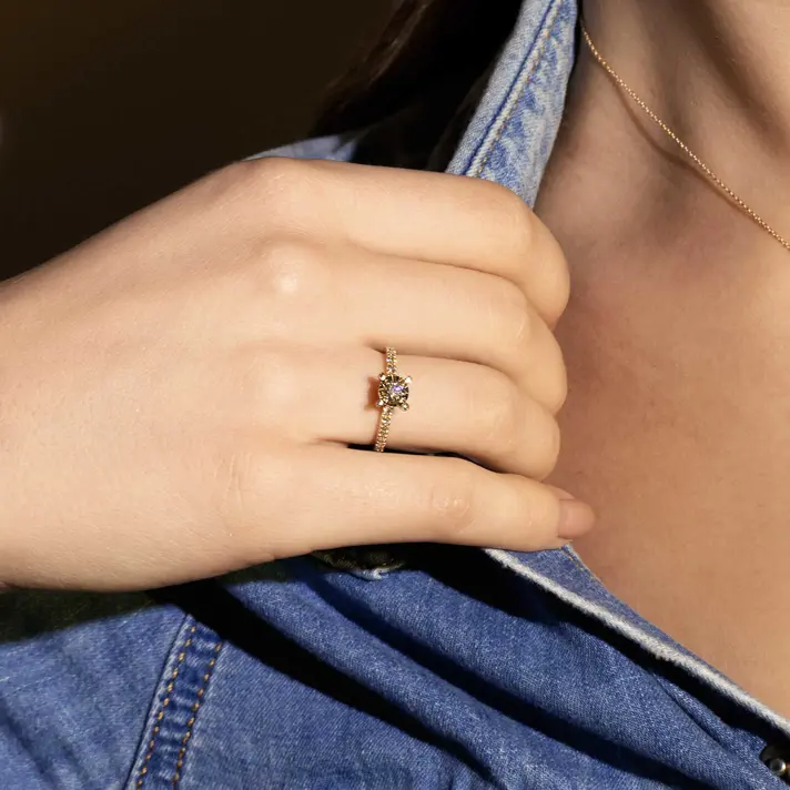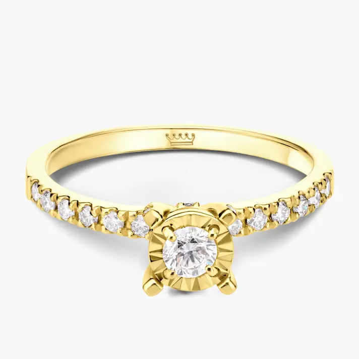 טבעת זהב 14K משובצת 32 יהלומים טבעיים ונוצצים על זרועות הטבעת ובמרכזה יהלום גדול מוקף מסגרת בזהב בעיבוד לייזר המייצר נצנוץ.