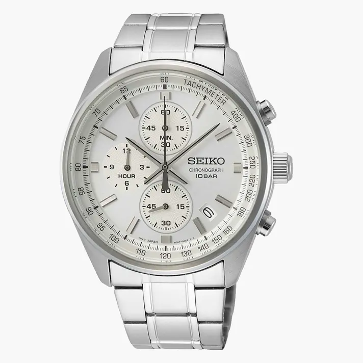 שעון SEIKO כרונוגרף בעל לוח לבן הכולל סטופר ותאריכון. לשעון צמיד מתכת איכותי, זכוכית HARDLEX למניעת שריטות ועמידות למים עד לעומק 100 מטר. קוטר השעון 41.5 מ"מ ועוביו 12.2 מ"מ.