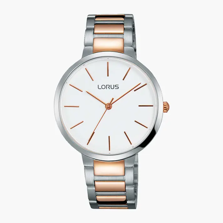 שעון LORUS לנשים מבית SEIKO, בשילוב צבעי זהב לבן ואדום . לוח לבן ומחוגים וסימוני ספרות בזהב אדום .