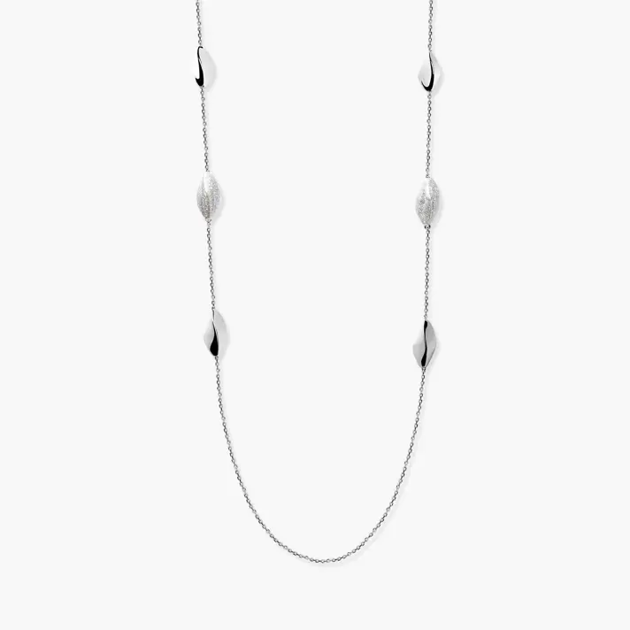 שרשרת זהב 14K לבן ועליה אבני זהב לבן בגימור מבריק כאשר 2 מהן מצופות בקריסטלים נוצצים. אורך השרשרת 70 ס"מ, גודל אבני הזהב 1.5*0.7 ס"מ.