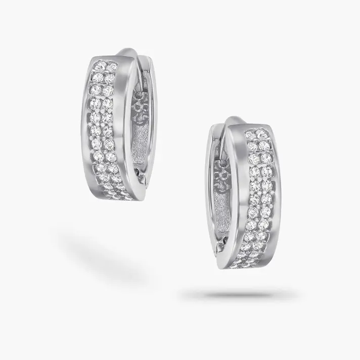עגילי זהב 14K לבן חישוקיים בקוטר 1 ס"מ משובצצים בשתי שורות של אבני זירקון נוצצות.
