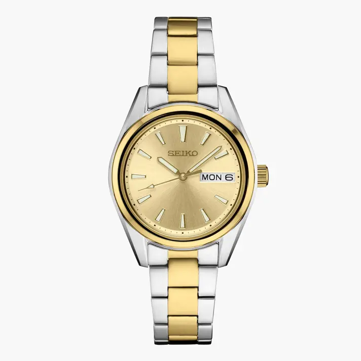 שעון SEIKO לנשים בעל לוח מתכתי מוזהב הכולל תאריכון עם היום בשבוע. לשעון צמיד מתכת המשלב גווני זהב לבן וצהוב, זכוכית קריסטל למניעת שריטות, ומנגנון קוורץ. השעון עמיד למים עד לעומק 100 מטר וקוטרו 30 מ"מ.