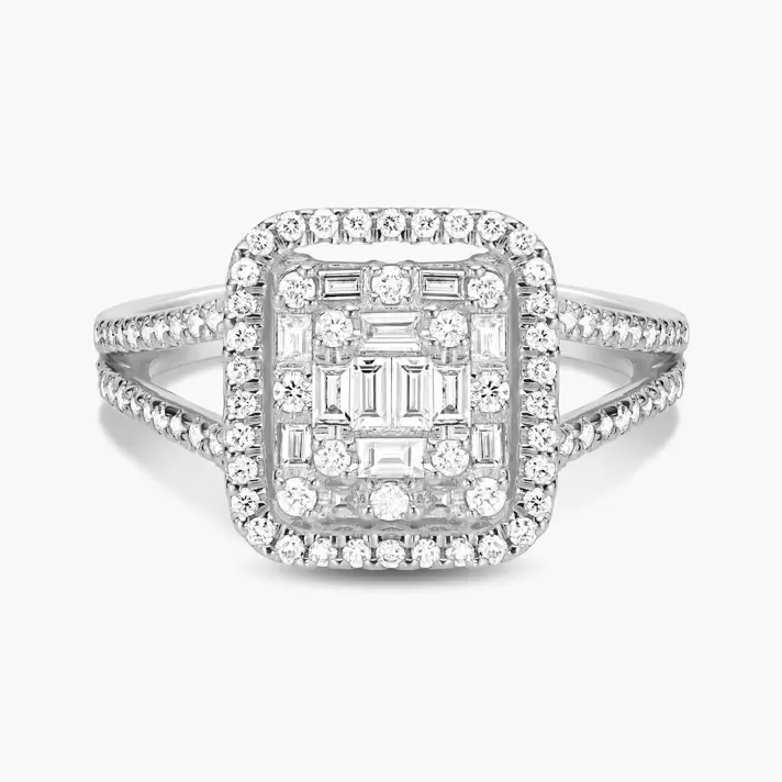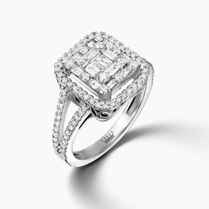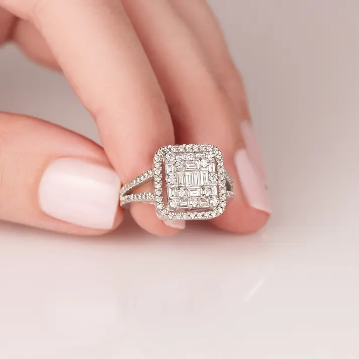 טבעת זהב 14K ובמרכזה מבנה מרובע המתנשא מעל לגובה הטבעת ומשובץ ביהלומי באגט יוקרתיים. סה"כ משובצים בטבעת כ 104 יהלומים טבעיים ונוצצים בנקיון SI ובצבע G. אורך ראש הטבעת 1.4 ס"מ, רוחב - 1.2 ס"מ