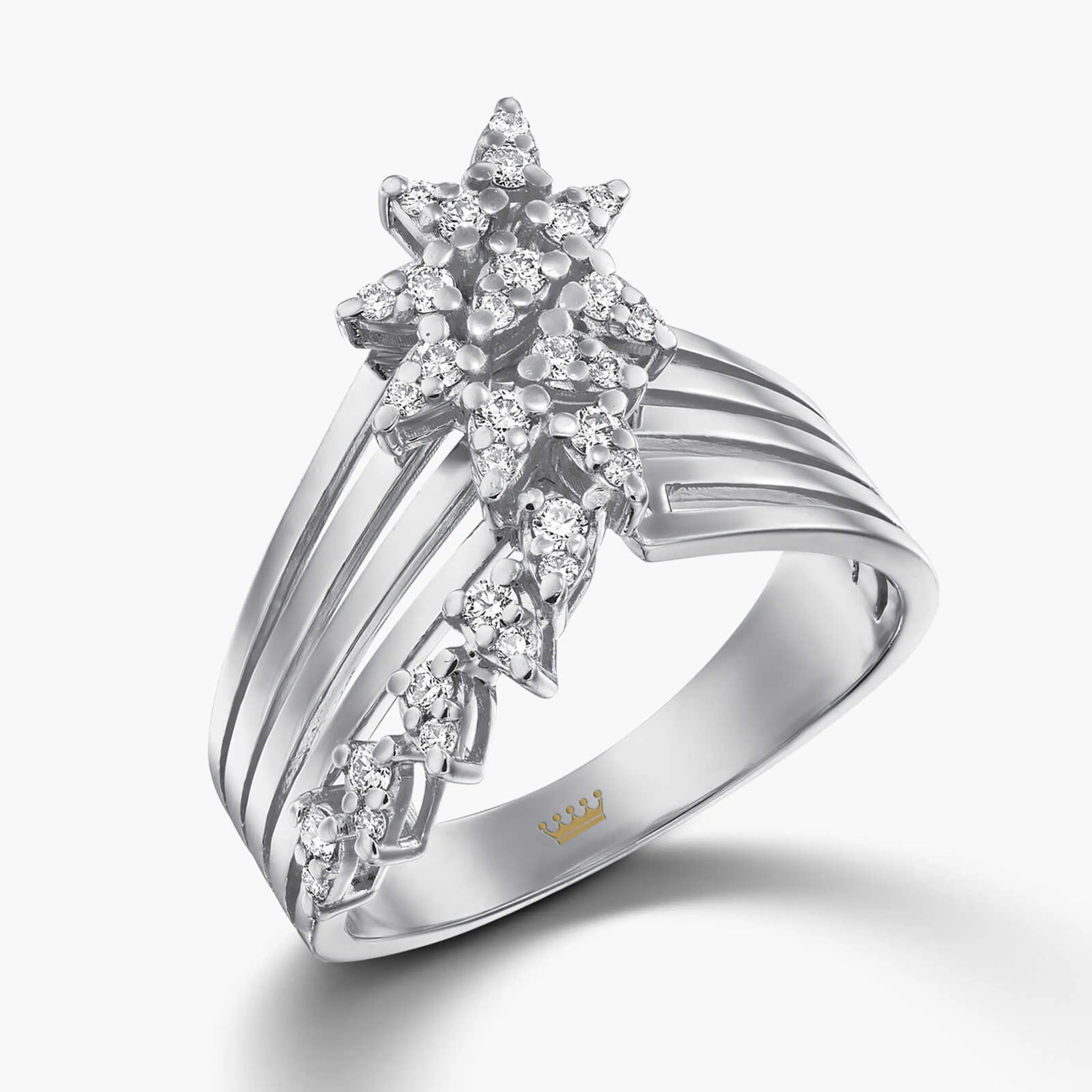 טבעת זהב 14K המעוצבת עם כוכבים המטפסים ועולים אל מחוץ לגבולות הטבעת משובצים ביהלומים טבעיים ונוצצים. סה"כ משובצים בטבעת 30 יהלומים במשקל של 0.31 קראט בנקיון SI ובצבע H .