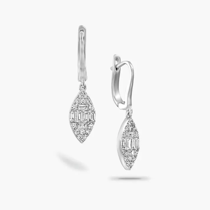 עגילי זהב 14K משובצים ב 44 יהלומים נוצצים וטבעיים בחיתוך באגט ועגול, במשקל 0.63 קראט בנקיון VS ובצבע H.