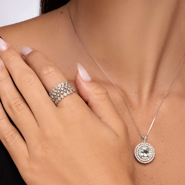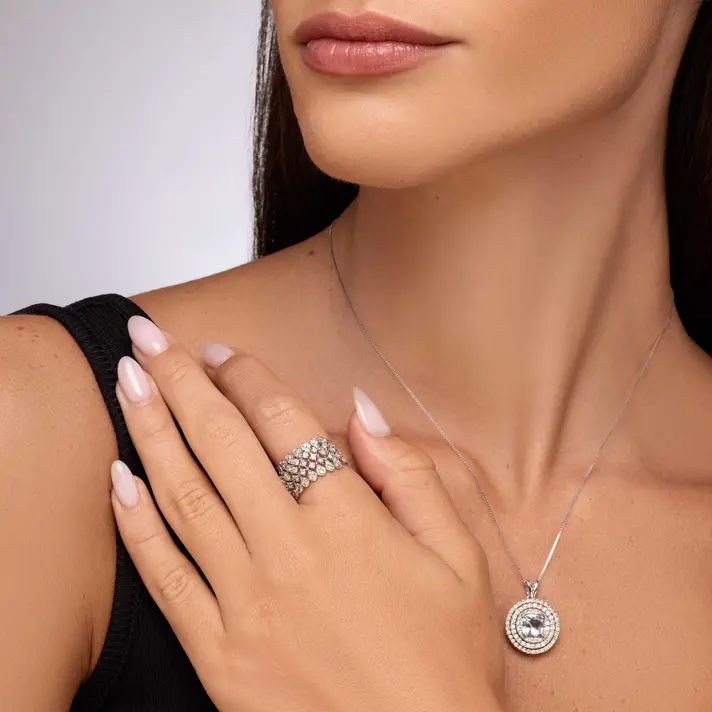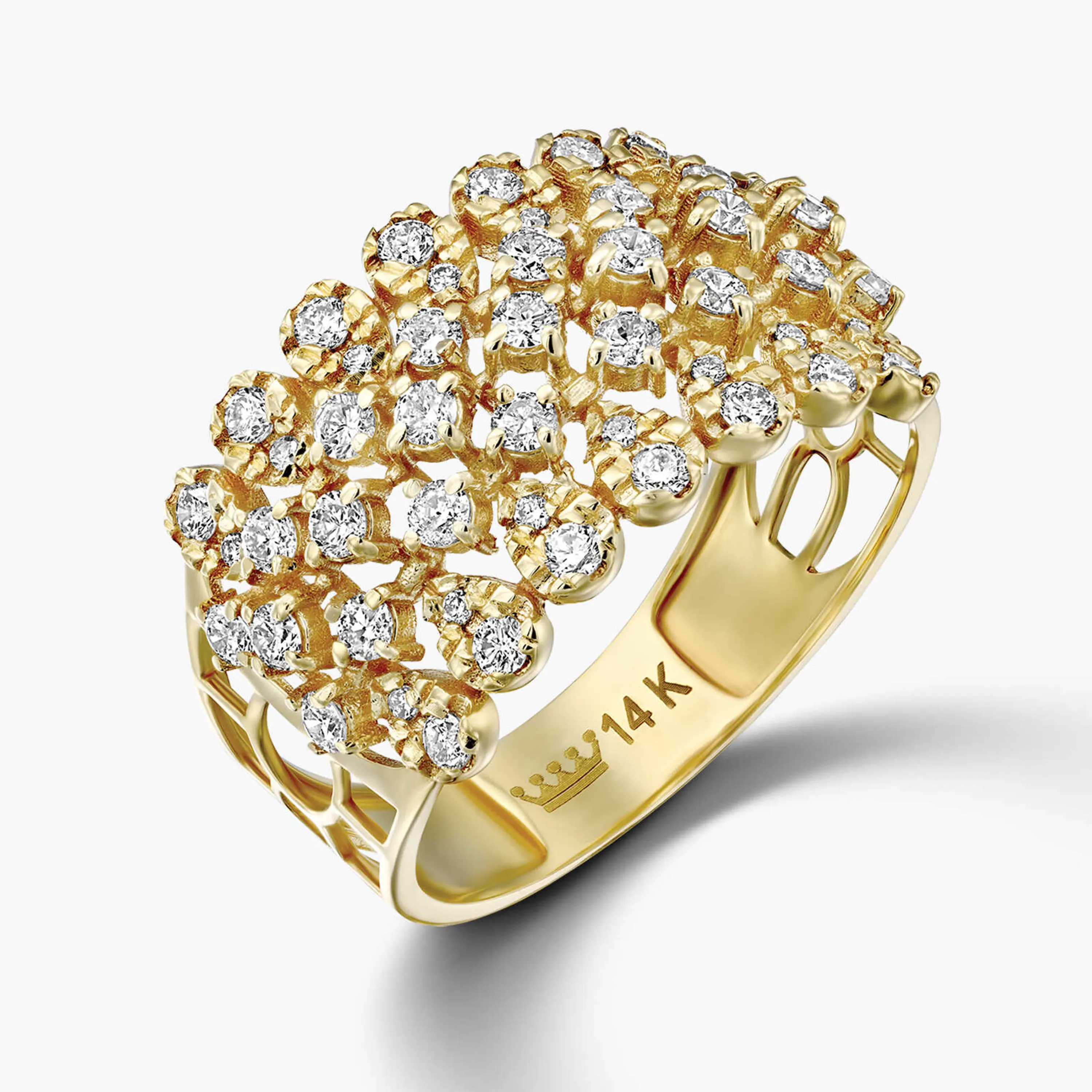 טבעת זהב 14K המשובצת 51 יהלומים נוצצים וטבעיים על פני 5 שורות. רוחב הטבעת מ1.2 ס"מ עד 0.4 ס"מ