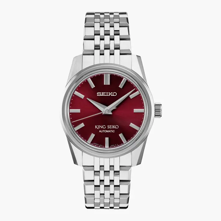 שעון KING SEIKO בעל מנגנון אוטומטי 6R31 ועתודת כוח של 70 שעות. לוח השעון אדום כהה ,לשעון זכוכית ספיר קריסטל המונעת שריטות עם ציפוי אנטי רפלקטיבי. לשעון רצועת מתכת איכותית. קוטר השעון 37 מ"מ והוא עמיד במים עד לעומק 100 מטר.