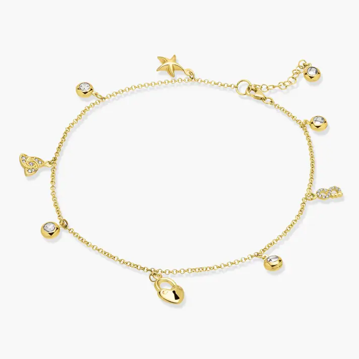צמיד רגל באלי עשוי זהב 14K צהוב, משובץ צ'ארמים. אורך הצמיד 24 ס"מ עם אפשרות הארכה של 3.5 ס"מ נוספים.