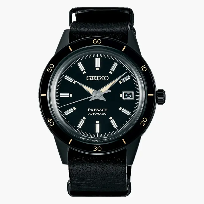 שעון SEIKO מסדרת PRESAGE 1960 בעיצוב וינטג' עם לוח שחור ומסגרת שחורה. סימוני הספרות והמחוגים מחופים בלומיברייט הזוהר בחושך. הלוח כולל גם תאריכון. מנגנון השעון מנגנון השעון אוטומטי 4R35 המסוגל לשמור אנרגיה עד ל 41 שעות. זכוכית השעון מסוג HARDLEX למניעת שריטות. גוף השעון עשוי פלדת אל חלד. רצועת השעון עשויה עור איכותי. קוטר השעון 40.8 מ"מ. השעון עמיד למים ל 50 מטר עומק וצידו האחורי שקוף ודרכו ניתן לראות את המנגנון.