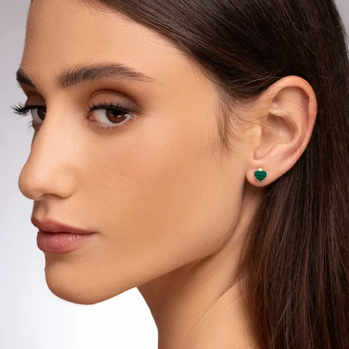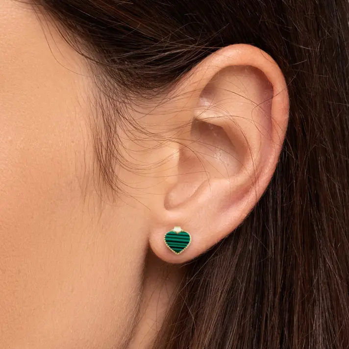 עגילי זהב 14K בצורת לב משובצים באבני מלכית ירוקות . אורך העגילים 0.9 ס"מ ורוחבם 0.7 ס"מ.