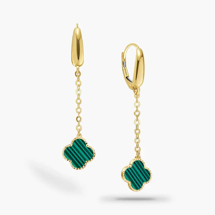 עגילי זהב 14K באורך 4.3 ס"מ ובסופן פרח המשובץ באבן משכית ירוקה.