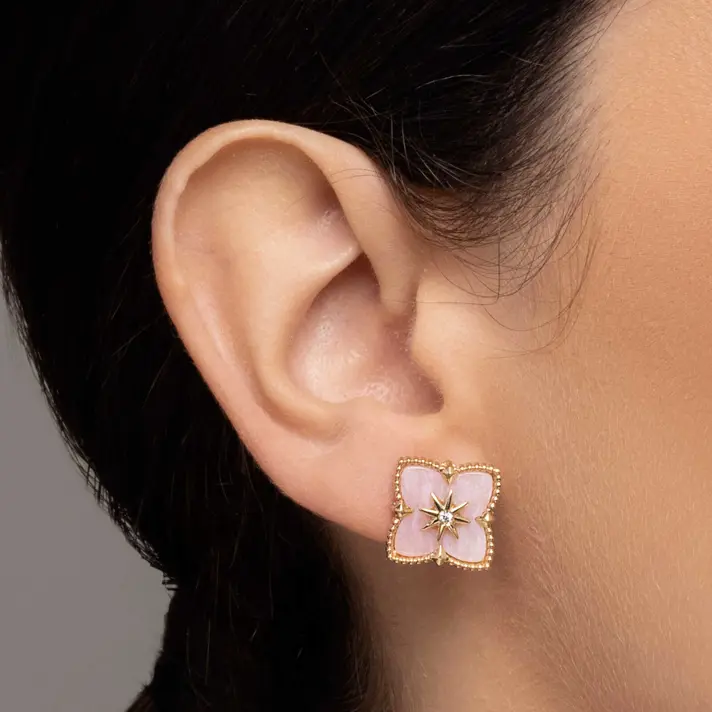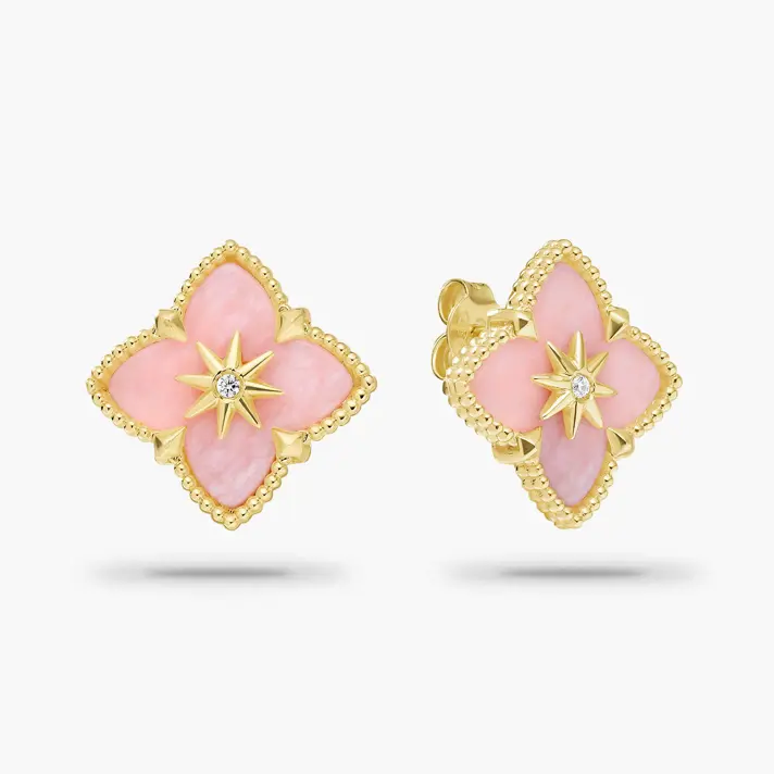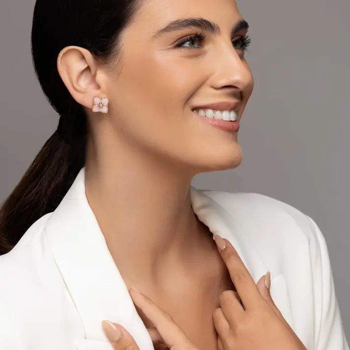 עגילי תלתן ורוד עשויים זהב 14K צהוב, צמודים ובשילוב פינק אופל. מידות העגיל 1.3*1.3 ס"מ