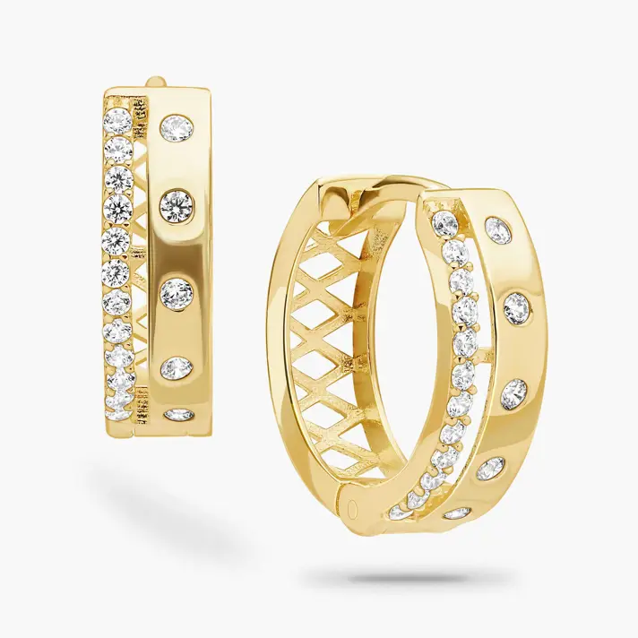 עגילי אנאבל עשויים זהב 14K בצורת חישוק ובשיבוץ זרקונים נוצצים. מידות העגילים 1.6 ס"מ,רוחב 0.4 ס"מ
