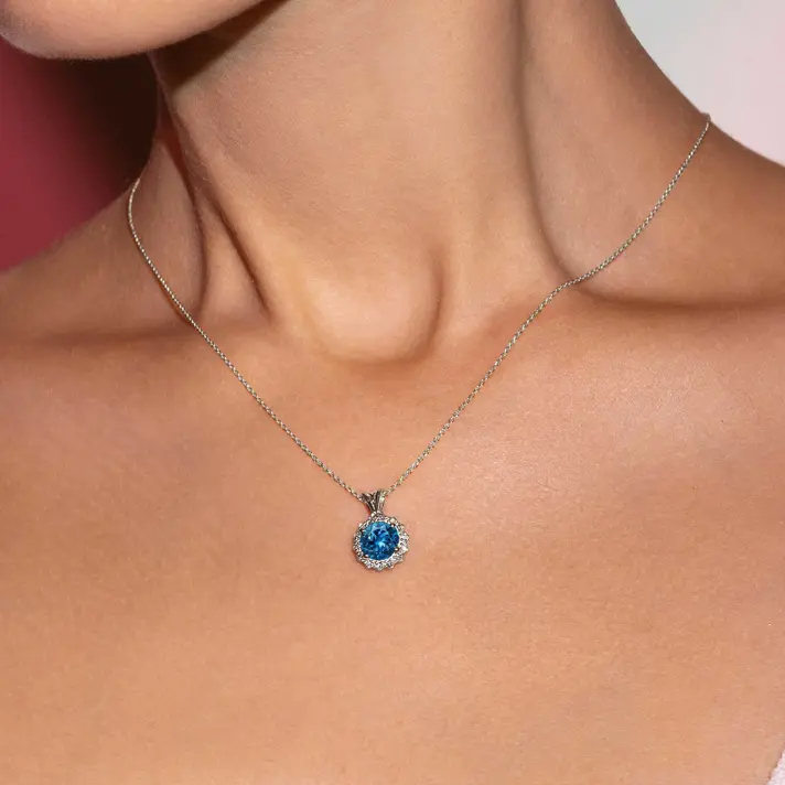 תליון זהב 14K המשובץ מעגל של 14 יהלומים טבעיים ונוצצים ובמרכזם אבן בלו לונדון. קוטר התליון 1 ס"מ.
