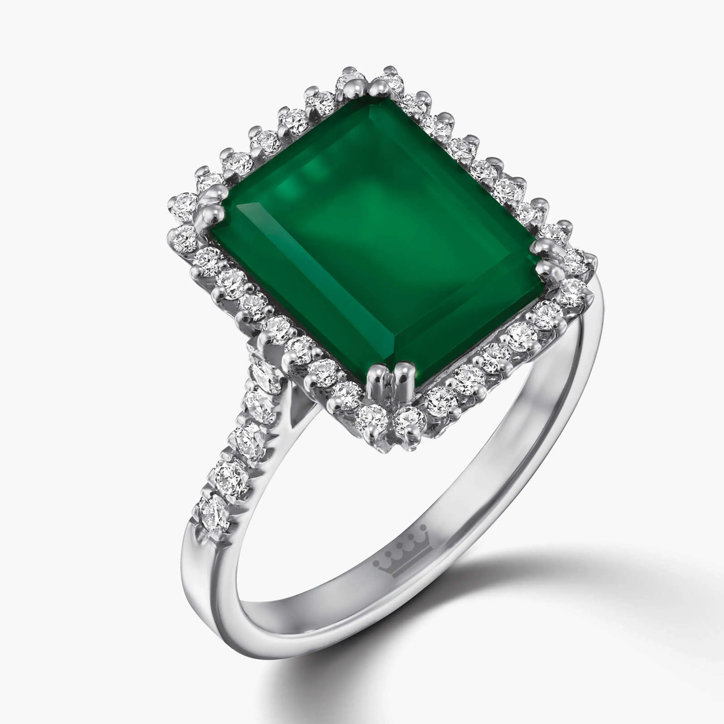 טבעת זהב 14K משובצת אבן אגת ירוקה מרובעת בגודל 8X10 מ"מ מוקפת 42 יהלומים טבעיים ונוצצים.
