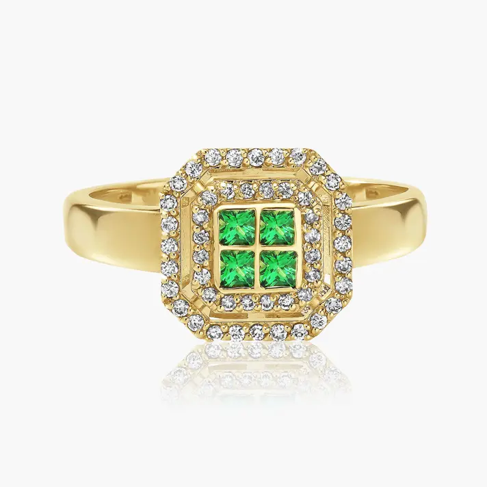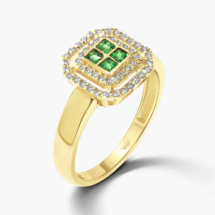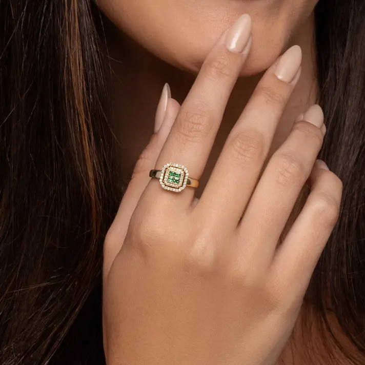 טבעת זהב 14K מסדרת החושן בעלת ראש מרובע משובצת באבני גרנט ירוקות מוקפות 48 יהלומים טבעיים ונוצצים. מידות ראש הטבעת 1.1*1.1 ס"מ.
