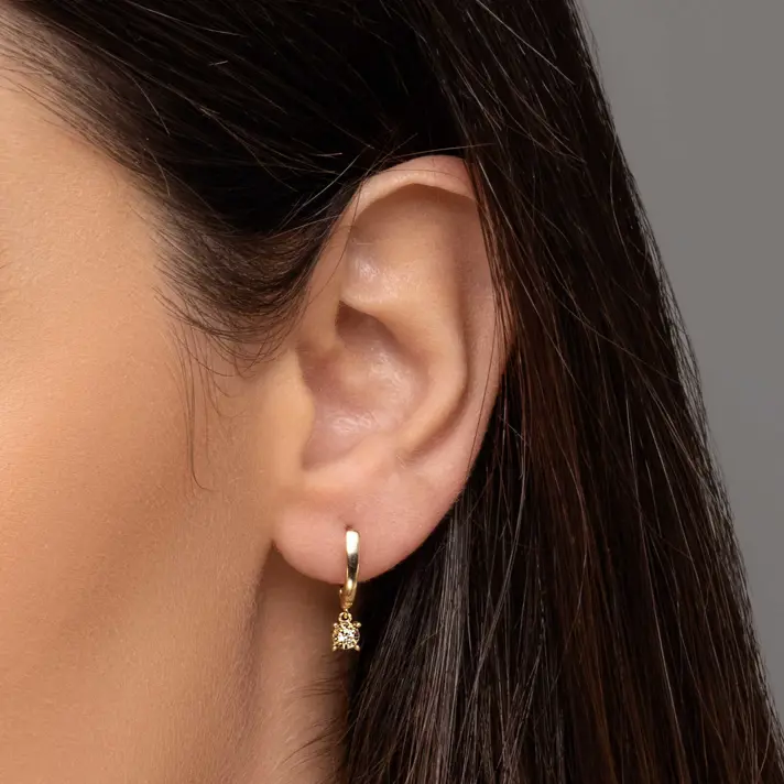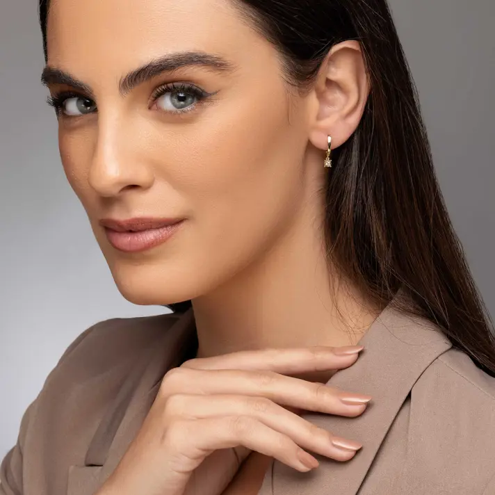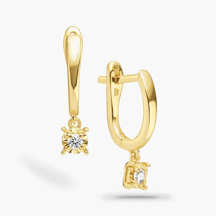 עגילי זהב 14K חצי חישוק ועליהם תלויים 2 יהלומים טבעיים ונוצצים. גובה העגילים 1.5 ס"מ.