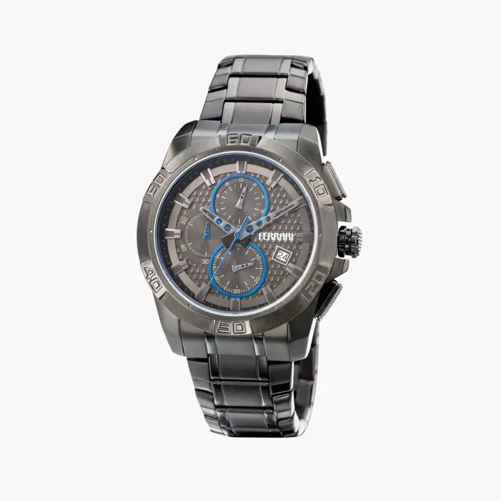 שעון FERRARI ספורטיבי לגברים, בנוי מפלדה מושחמת. בשעון סטופר, תאריכון , צמיד מתכת איכותי ועמידות למים.