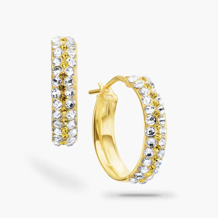 עגילי חישוק בזהב 14K משובצות אבני סברובסקי נוצצות. גובה העגילים 1.7 ס"מ.