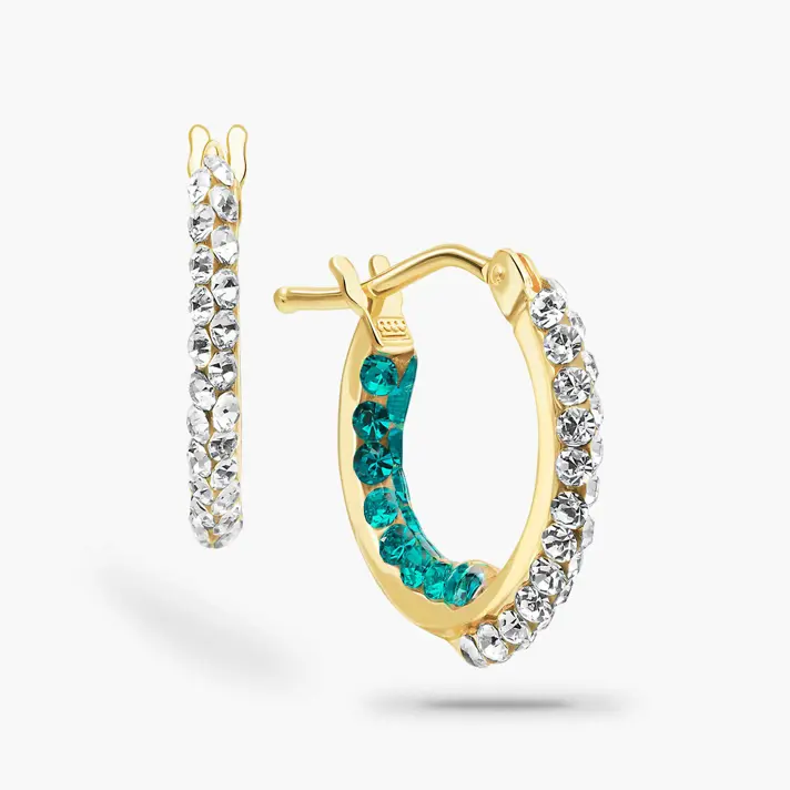 עגילי חישוק בזהב צהוב 14K משובצים באבני סברובסקי נוצצות בצבע ירוק בחלקם הפנימי ולבנות בחלקם החיצוני. קוטר העגילים 1.3 ס"מ.