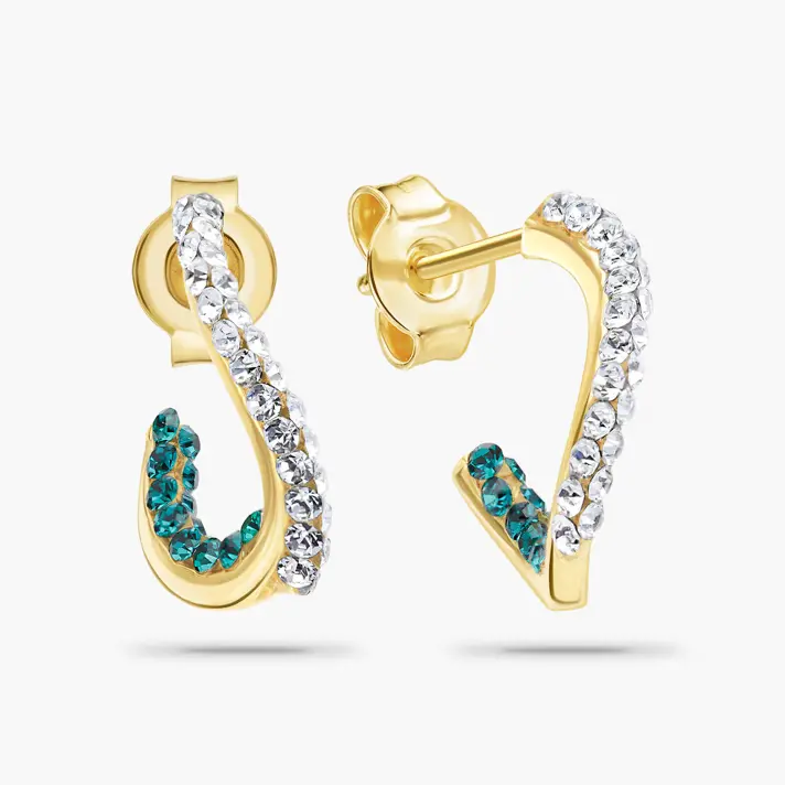 עגילי זהב 14K משובצים באבני סברובסקי לבנות בחלקן החיצוני וירוקות בחלקן הפנימי. אורך העגילים 1.3 ס"מ