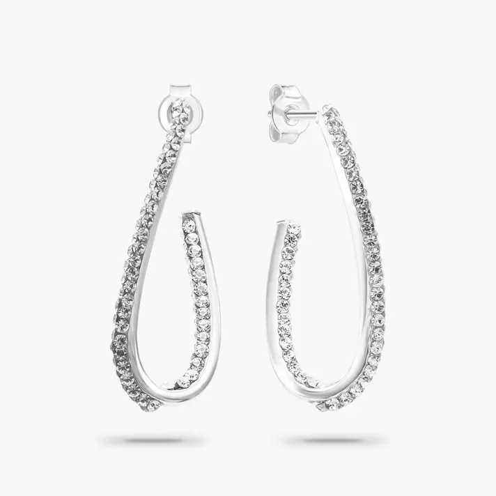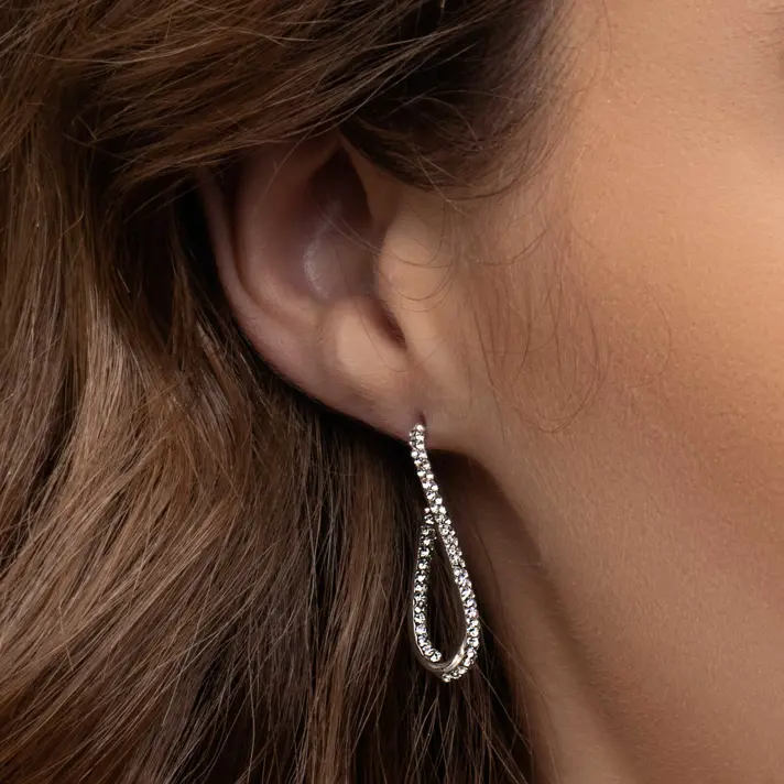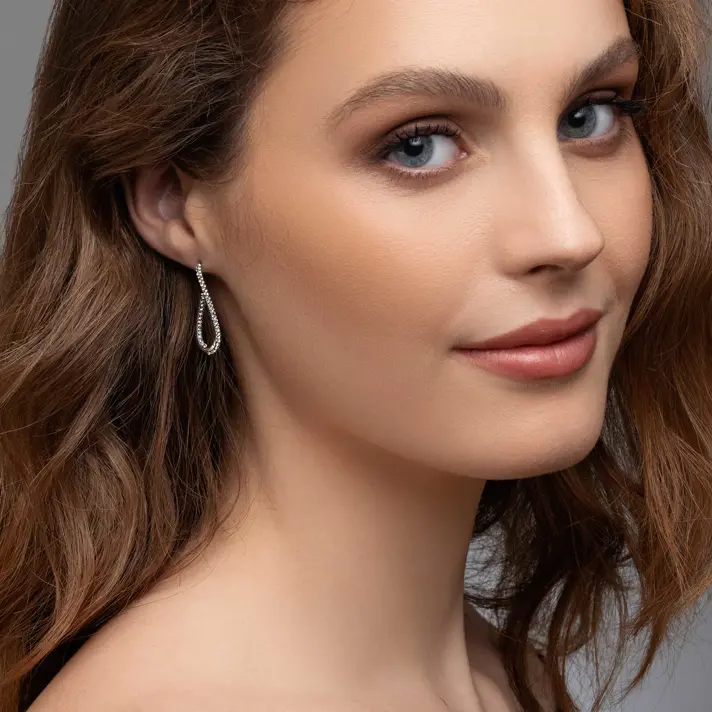 עגילי זהב 14K משובצים באבני סברובסקי בגווני אפור- לבן. אורך העגילים 3 ס"מ.