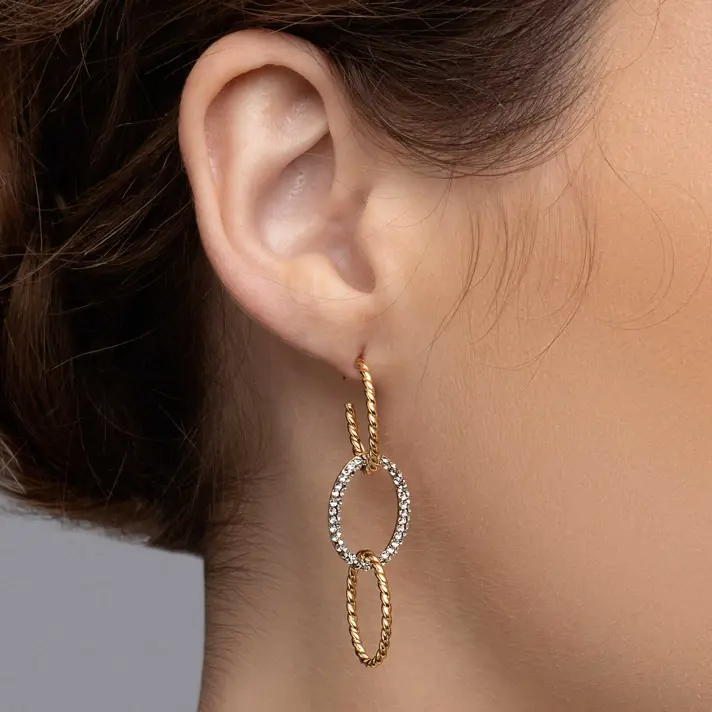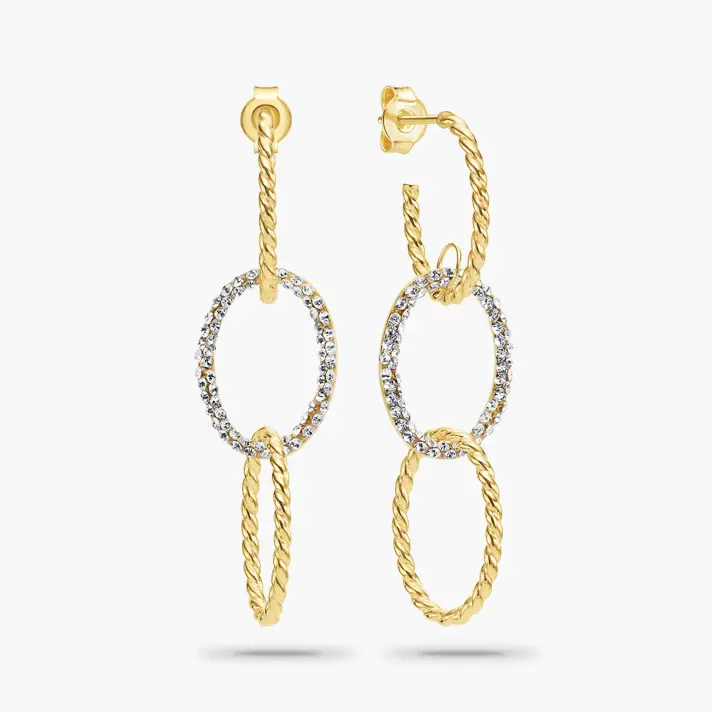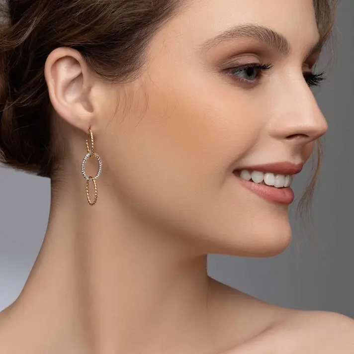 עגילי זהב 14K עם אליפסות תלוייות בגימור חבל כאשר האליפסה האמצעית משובצת בזירקונים נוצצים. אורך העגילים 4.8 ס"מ.