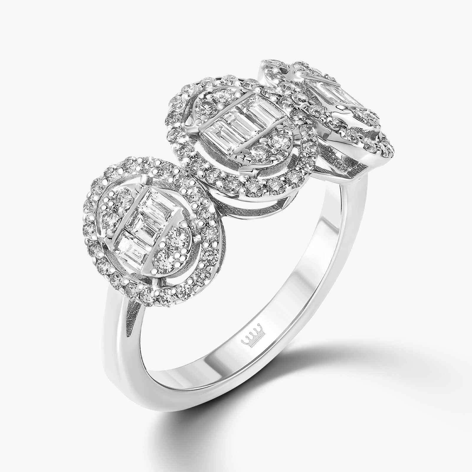 טבעת טיילור עשויה זהב 14K לבן ומשובצת 81 יהלומים טבעיים ונוצצים, מתוכם 9 בחיתוך באגט היוקרתי.