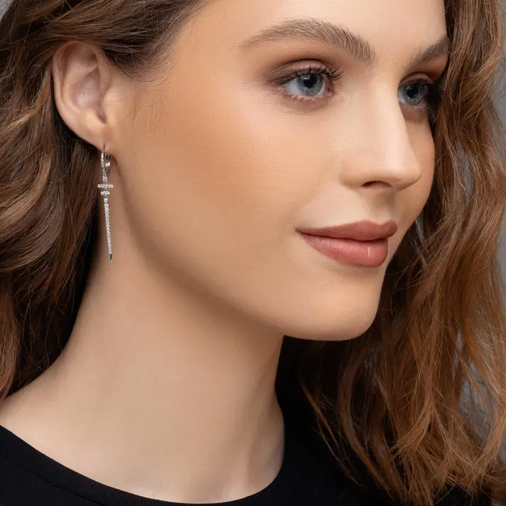 עגילי רוקסן ארוכים עשויים זהב לבן 14K ומשובצים ב 66 יהלומים טבעיים ונוצצים.