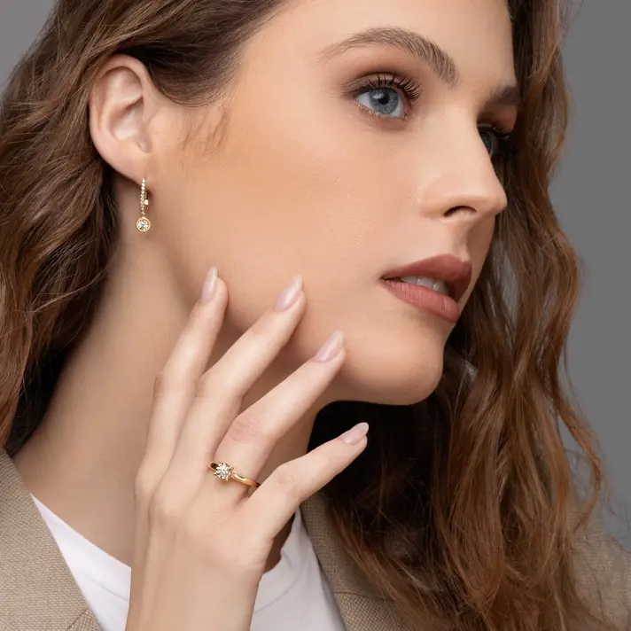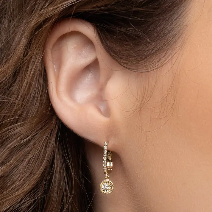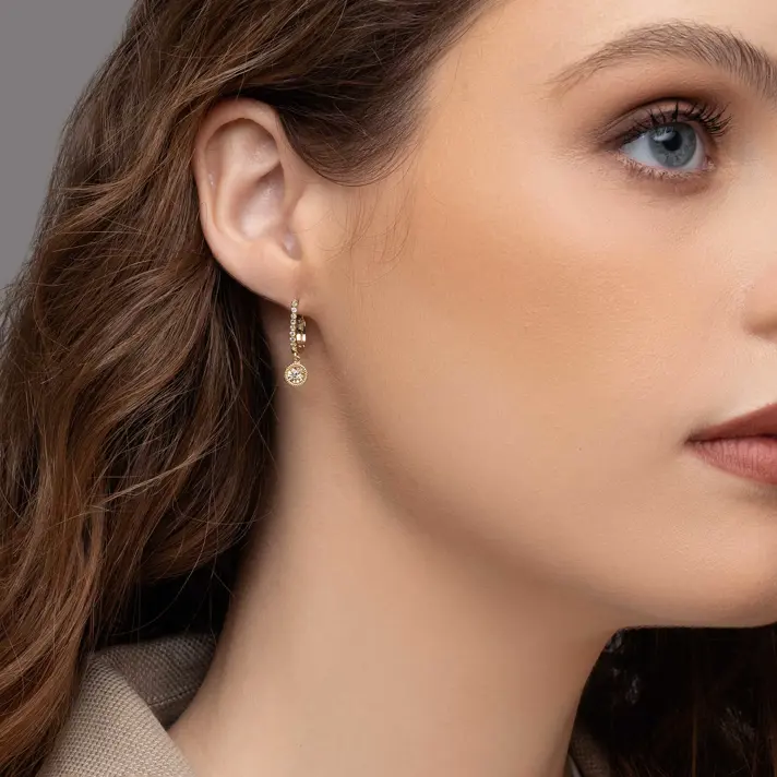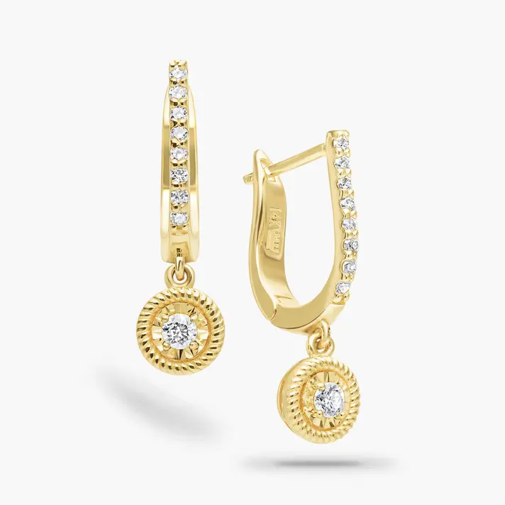 עגילי זהב 14K המשובצים לאורכם ביהלומים ובסופם מעגל זהב משובצים יהלומים מוקפים בזהב בעיבוד לייזר. אורך העגילים 2.2 ס"מ.