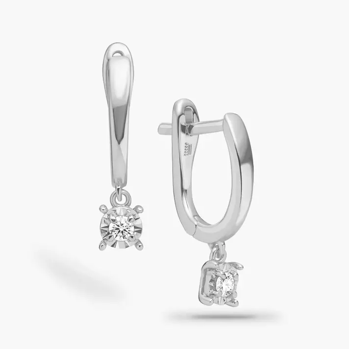 עגילי זהב 14K חצי חישוק ועליהם תלויים 2 יהלומים טבעיים ונוצצים. גובה העגילים 1.5 ס"מ.