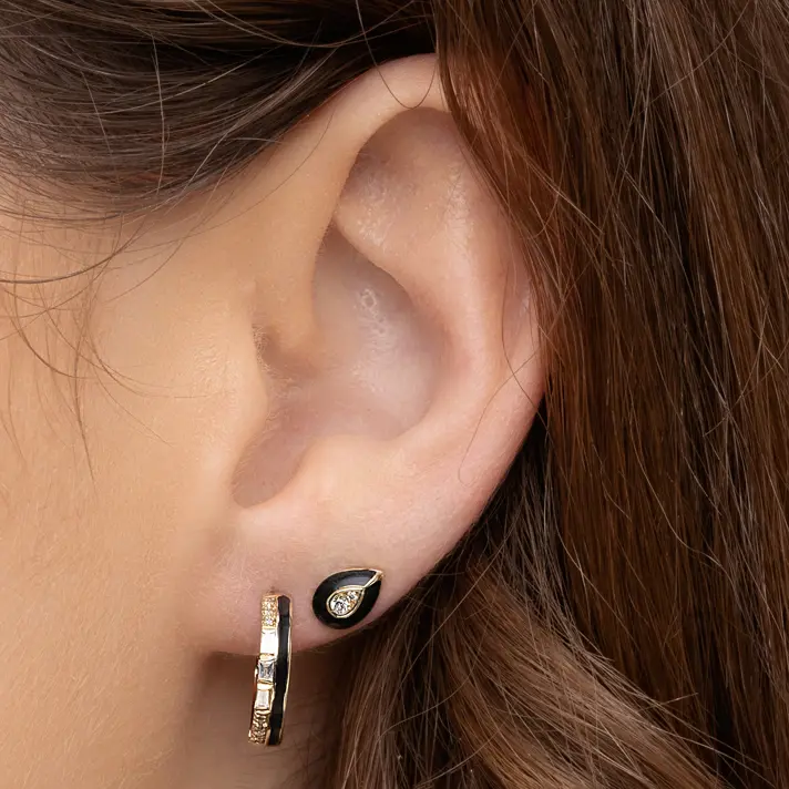 עגילי זהב מסדרת Black Series משובצים יהלומים ופס אמייל שחור