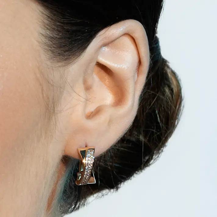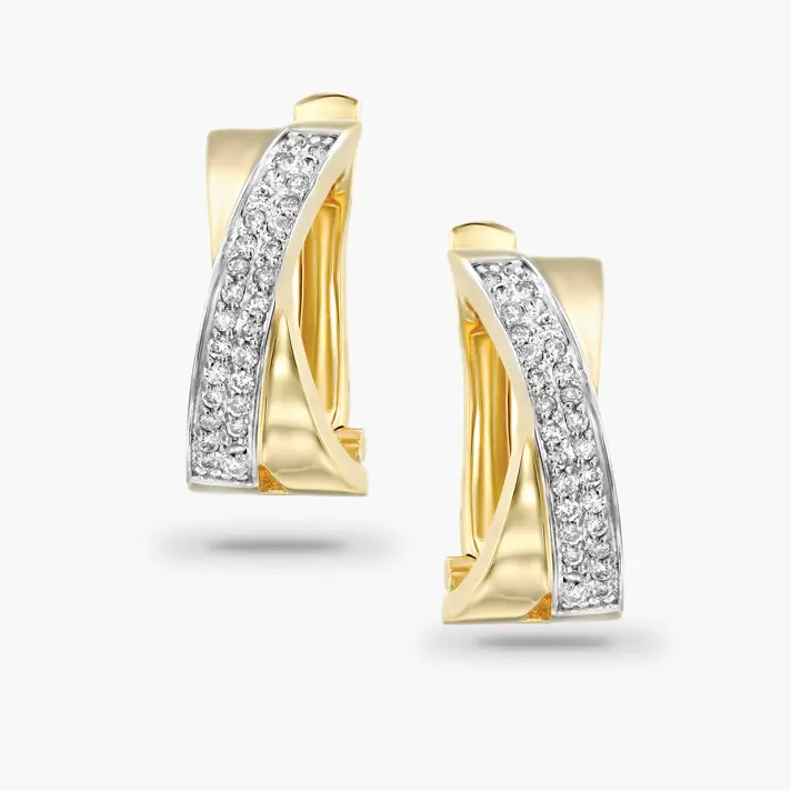 עגילי זהב 14K המשלבים זהב צהוב ולבן ומשובצים 60 יהלומים טבעיים ונוצצים במשקל רבע קראט. גובה העגיל 1.5 ס"מ, רוחבו מ0.8 ס"מ עד 0.3 ס"מ