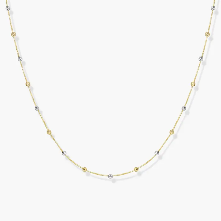 שרשרת בוסטון מזהב 14K בשילוב חרוזי זהב ביקולור בצבעי זהב לבן/ צהוב בגימור לייזר. מידת כדורי הזהב 1 מ"מ. מידות השרשרת 42 ס"מ עם אפשרות להארכה ב- 3 ס"מ נוספים.