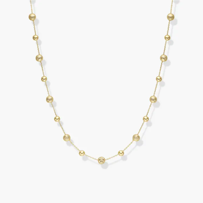 שרשרת טוקיו מזהב 14K בשילוב חרוזי זהב צהוב בגדלים משתנים ובגימור משתנה, חלקם בגימור חלק וחלקם בגימור לייזר. מידות כדורי הזהב 3,5 מ"מ. מידות השרשרת 40 ס"מ עם אפשרות להארכה ב 3 ס"מ נוספים.