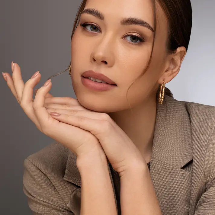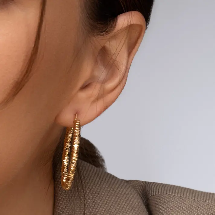 עגילי זהב חישוקים בגימור מחוספס בקוטר 3.6 ס"מ.