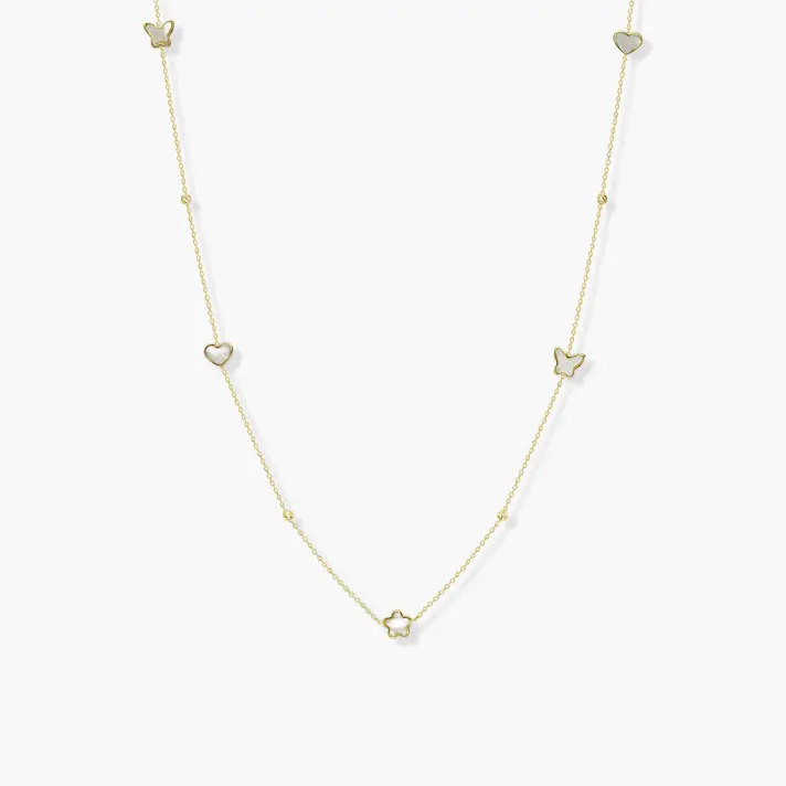 שרשרת זהב 14K עם לבבות, פרחים ופרפרים משובצים צדף. אורך השרשרת 75 ס"מ עם עוד 5 ס"מ הניתנים להארכה.