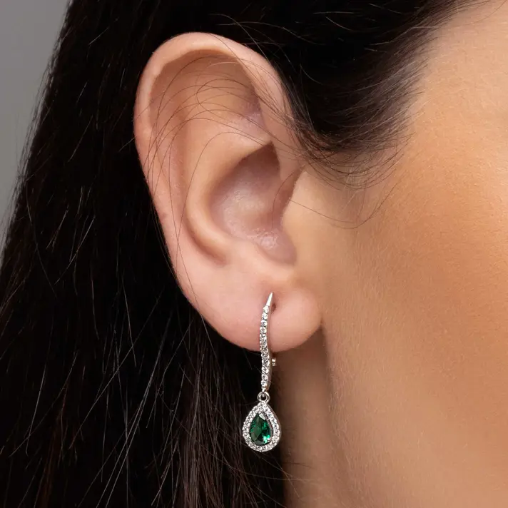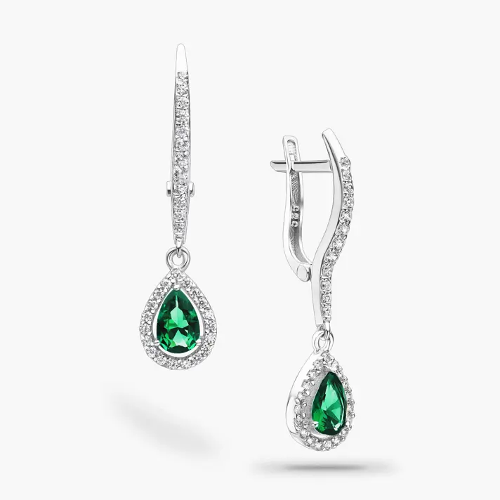 עגילי זהב 14K עם אבני זירקון ירוקות בצורת טיפה התלויות בסופם. לכל אורך העגילים משובצים זירקונים נוצצים. אורך העגילים 3 ס"מ.