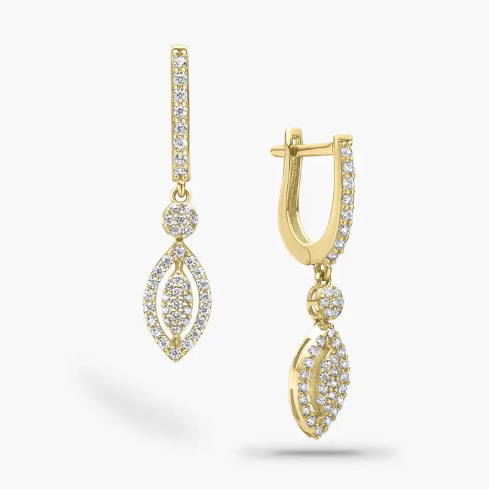 עגילי זהב 14K המעוצבים כשתי טיפות תלויות המשובצות בזירקונים נוצצים. אורך העגילים 3 ס"מ.