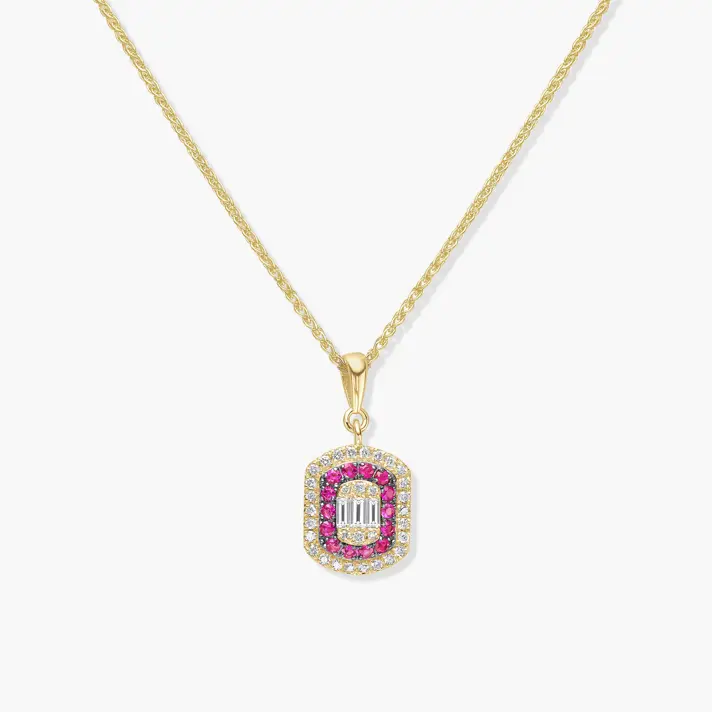 תליון מיה עשוי זהב 14K ומשובץ 14 אבני רובי ו35 יהלומים טבעיים ונוצצים מתוכם 3 בחיתוך באגט היוקרתי. מידות התליון 1*2 ס"מ כולל לולאה.