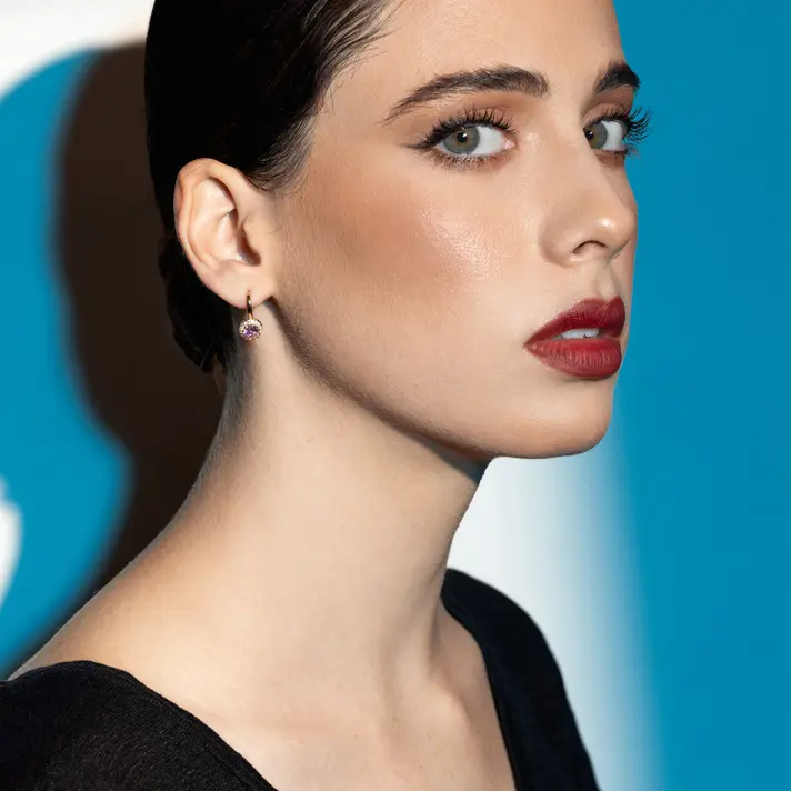 עגילי זהב משובצים אבן חן וורודה מוקפת זרקונים