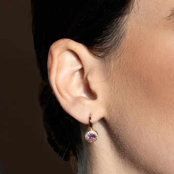 עגילי זהב 14K המשובצים אבני חן וורודות מוקפות באבני זירקון נוצצים. גובה העגילים 1.7 ס"מ. וקוטר האבן 0.8 ס"מ.