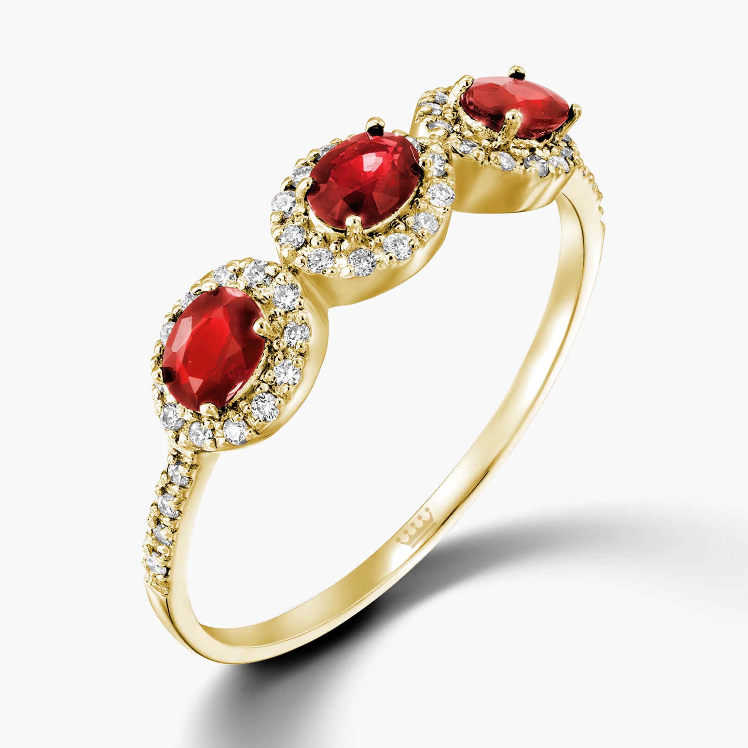 טבעת סטלה עשויה זהב 14K בשיבוץ 3 אבני רובי מרכזיות ו 50 יהלומים טבעיים ונוצצים.