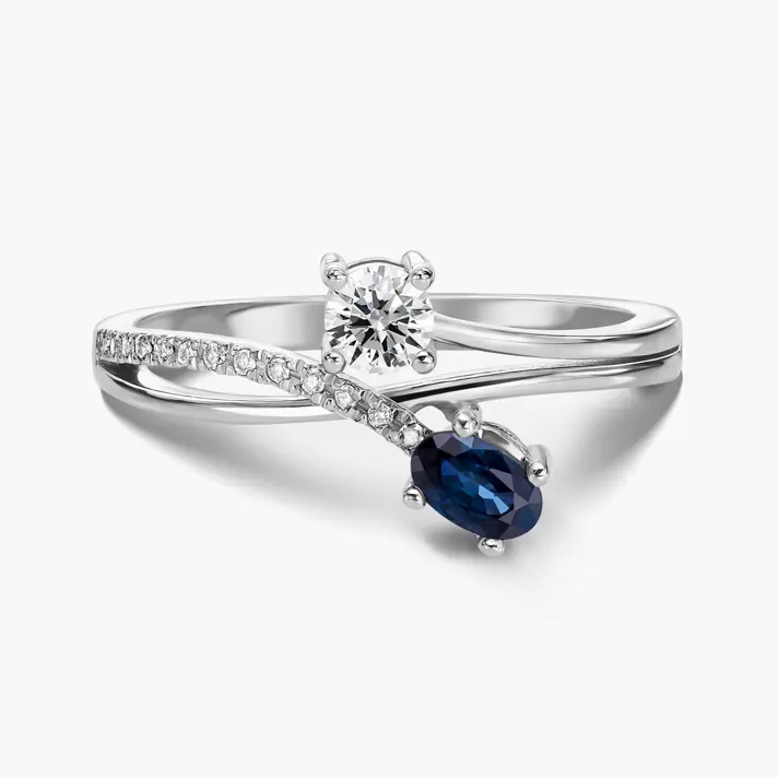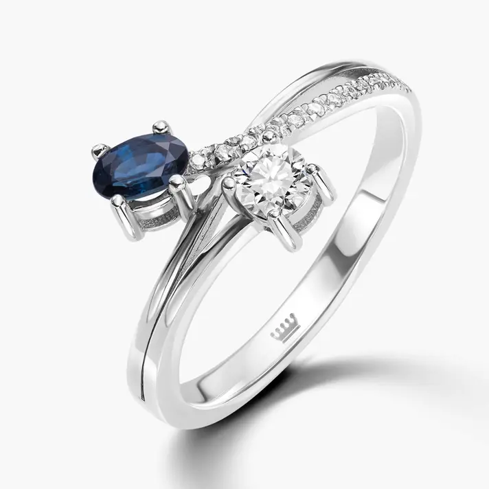 טבעת עם ראש כפול בשיבוץ יהלומים וספיר