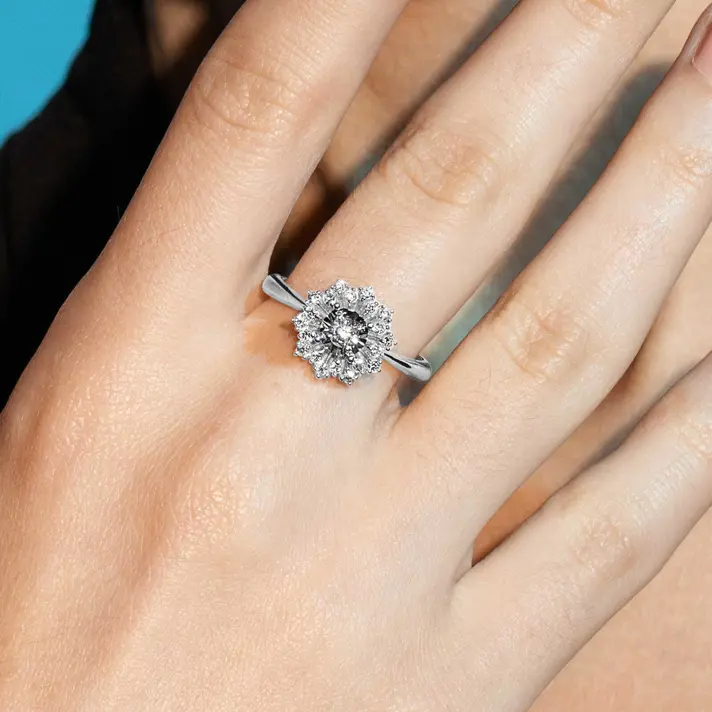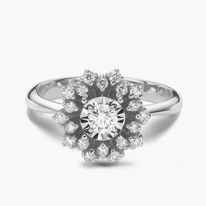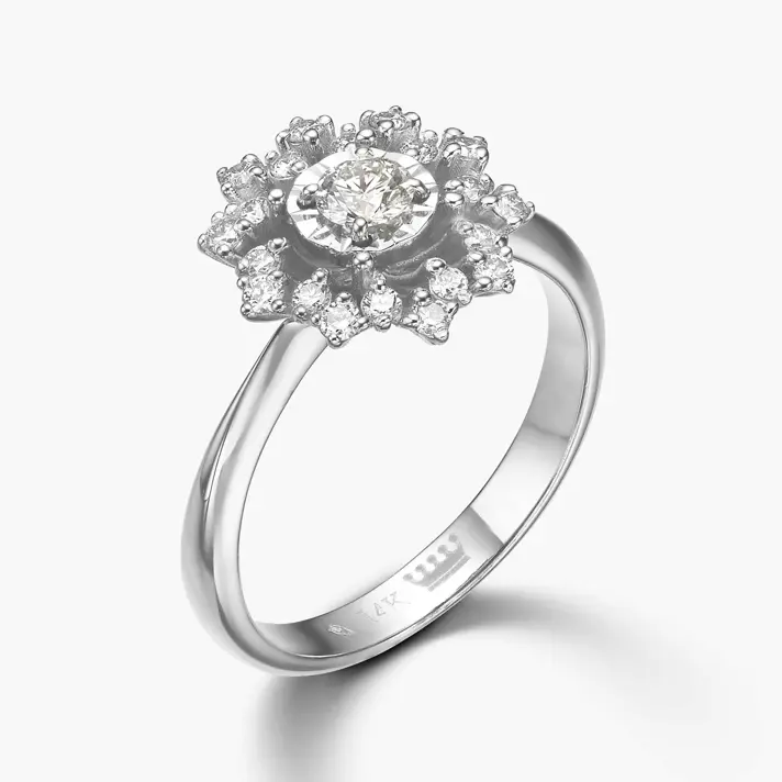 טבעת פרח עשויה מזהב 14K בצורת פרח ומשובצת ב 21 יהלומים טבעיים ונוצצים. מידות הטבעת- קוטר ראש הטבעת 1.3 ס"מ. קוטר עיגול פנימי 0.7 ס"מ. עובי הטבעת 1.5 מ"מ