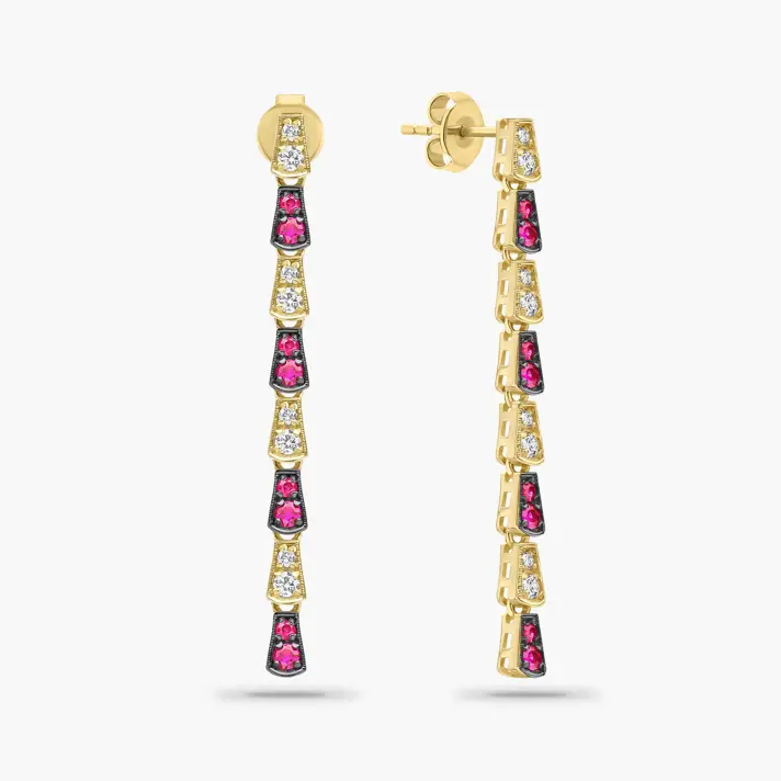 עגילי PARTY כי אין מה לעשות, הם עושים לנו חשק לחגוג! עשויים זהב 14K בשילוב 16 אבני רובי ו 16 יהלומים טבעיים ונוצצים למראה הכי גלאם שיש! אורך העגילים 3.8 ס"מ.